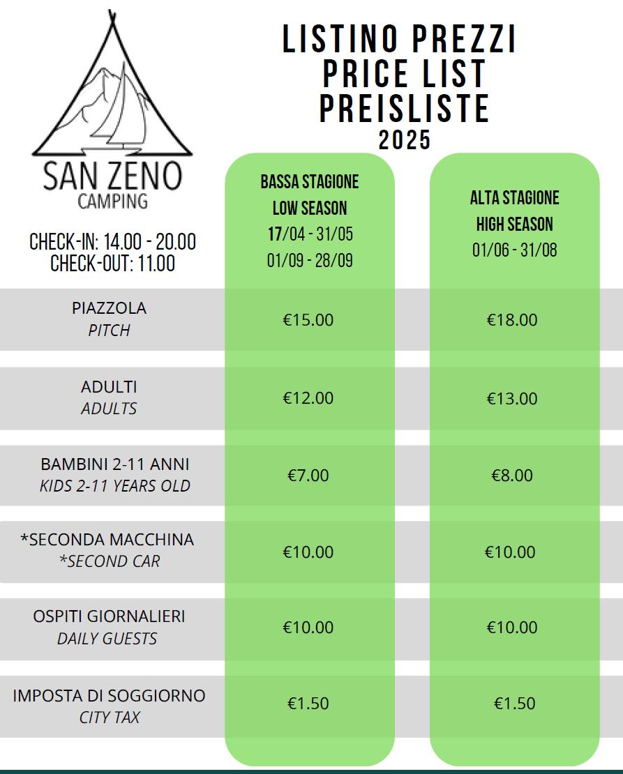 La superficie a disposizione degli ospiti è cresciuta nel corso degli anni fino alle attuali 90 piazzole realizzate all'interno del caratteristico uliveto. Piante che permettono la produzione e vendita di un olio pregiato messo a disposizione all'interno dello spaccio. Tutte le piazzole sono servite da adeguato allacciamento elettrico. Il camping "San Zeno" è aperto da maggio a settembre, la reception è aperta continuativamente dalle 8.00 alle 20.00, per le auto è possibile l'ingresso e la circolazione dalle 8.00 fino alle 23.00.